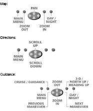 In Guidance mode you have no way of zooming in or out (because of the button issue below), but the setup allows you to set the zoom level near a maneuver (a turn, so to speak) so you can have your own preferred zoom level there a nice touch.