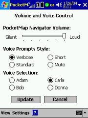 Personally I get annoyed by these announcements pretty quickly, and to my dismay could not find a place to switch them off. Not even disabling the volume on the Pocket PC helped the application simply ignored that and cranked the volume up again! ALK CoPilot does something similarly annoying but at least there it is a WAV file that you can delete to silence this unwanted blurb.