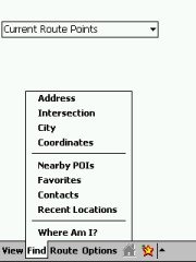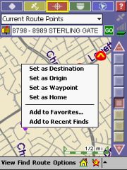 Map mode allows you to identify street segments (note the purple line in the left image below), POI's and other possible destinations. Any item that you select then populates the text field just below the "Current Route Points" drop down. Tapping the icon to the left of the field then brings up the context menu