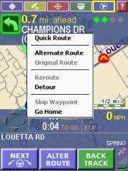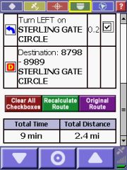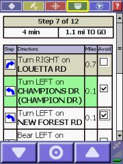 In the Directions mode you will see a step-by-step list of the maneuvers for your route. The current maneuver is highlighted in green. You can set temporary avoids for individual maneuvers by checking the checkbox and tapping onto "Recalculate Route". I found it very difficult to use though you have to take the stylus and scroll down to the end of the list to see the green button. The longer the list of instructions becomes the more difficult it becomes to identify the "right" piece to check.