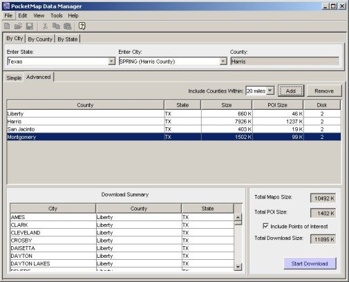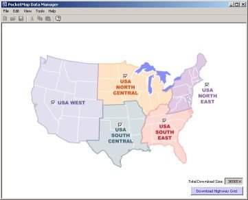 Map Download is one of the stronger points of PocketMap Navigator. You have a multitude of options to define which maps you want to download for use on the PDA. Interestingly enough these methods mostly boil down to determine which county maps are affected by your decision. This concept is similar to the one used in Mapopolis, but the graphical assistance makes this process less cumbersome for the end user than in the Mapopolis case.