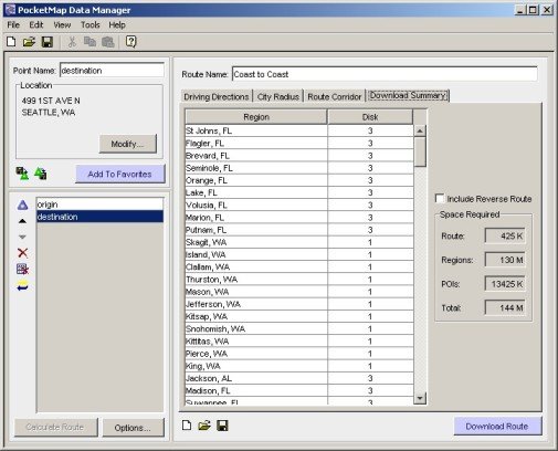 The other question is "Can it do Coast To Coast ?" Yes, it can! PocketMap Navigator does need the help of the desktop application, but thanks to the concept of counties and highway grids the map data for such a cross country trip is quite manageable.